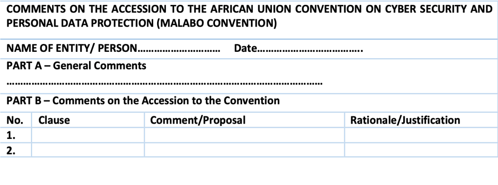 In accordance with Article 10 (2) of the Constitution, stakeholders and members of the public are hereby invited to submit their comments, proposals and recommendations through written memoranda on the Regulations, Regulatory Impact Assessment and the Data Sharing code in the following format: –
